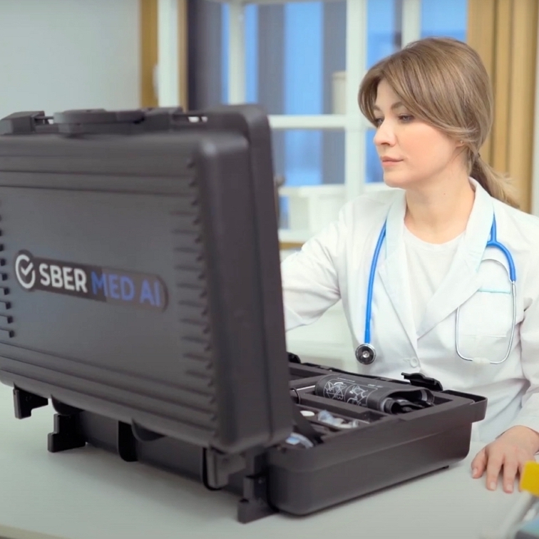Аппаратно-программный комплекс мобильной диагностики «Цифровой ФАП». Комплекс представляет собой диагностическое оборудование, собранное в компактный кейс для безопасной транспортировки и хранения, с подключением к интернету и сервисам на базе искусственного интеллекта.